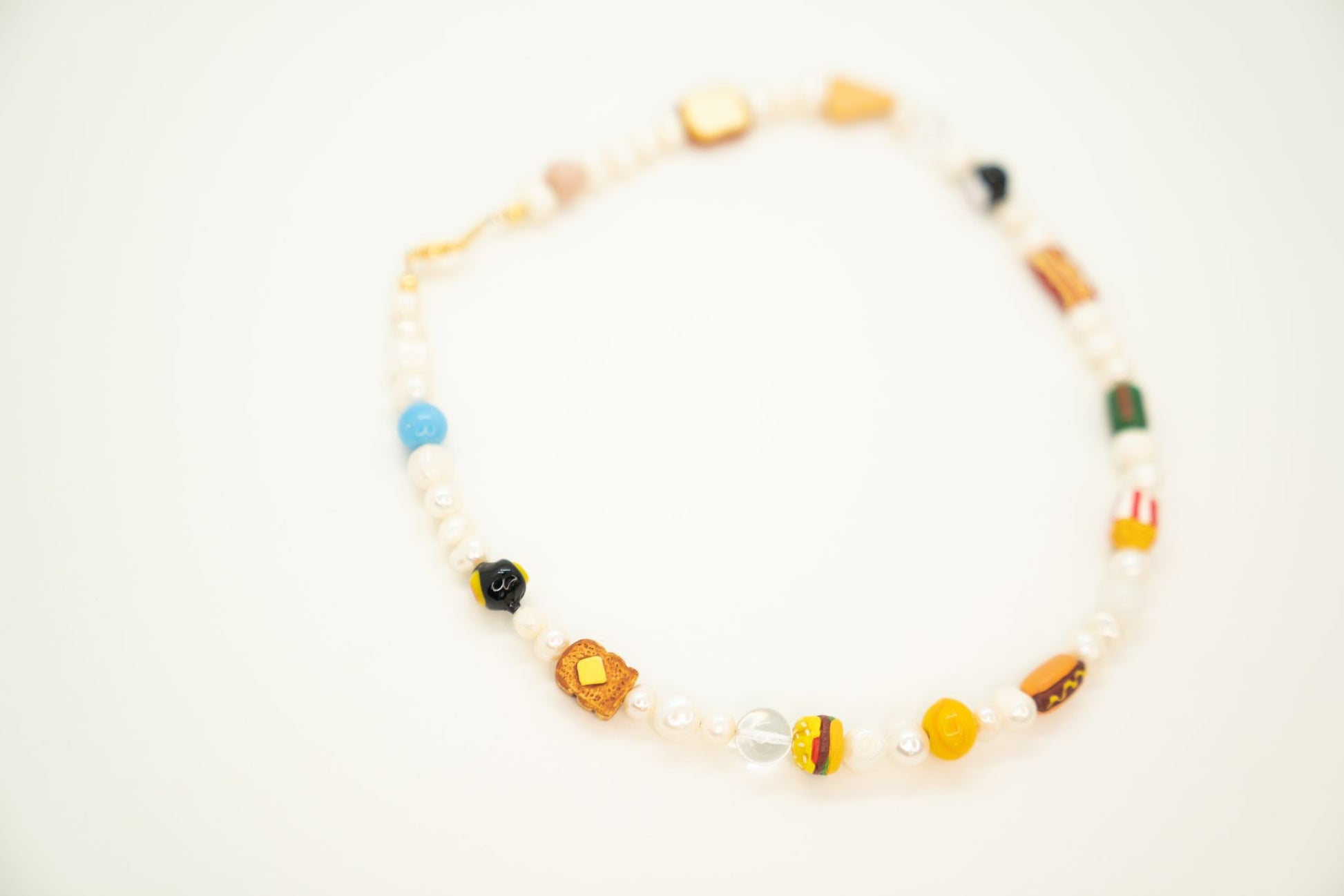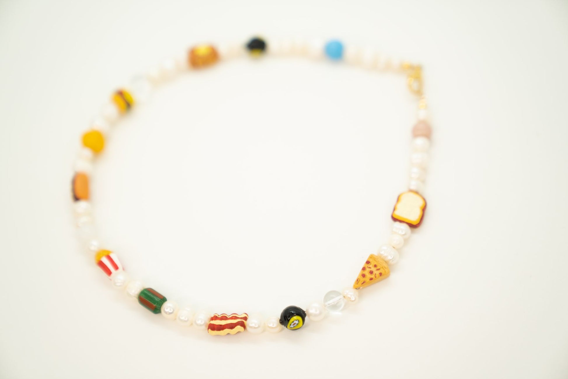 Made with natural freshwater pearls, glass blown beads, and ceramic beads.